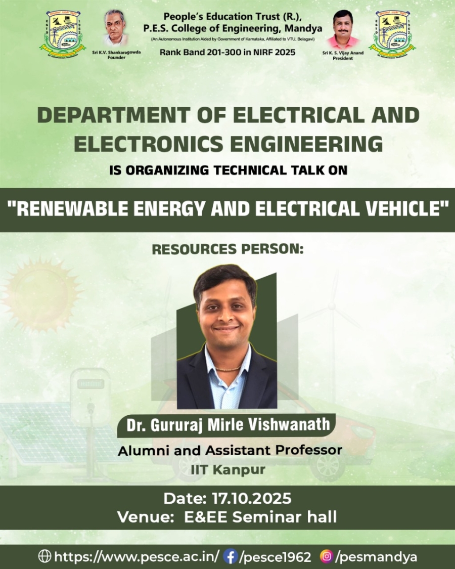 The Department of Electrical and Electronics Engineering was established right from the inception of the institute in the year 1962. Established with a vision to produce competent and skilled engineers, the department offers undergraduate and research programs. Electrical & Electronics Engineering Programme has been accredited by NBA for 3 years (2023-24 to 2026-27)