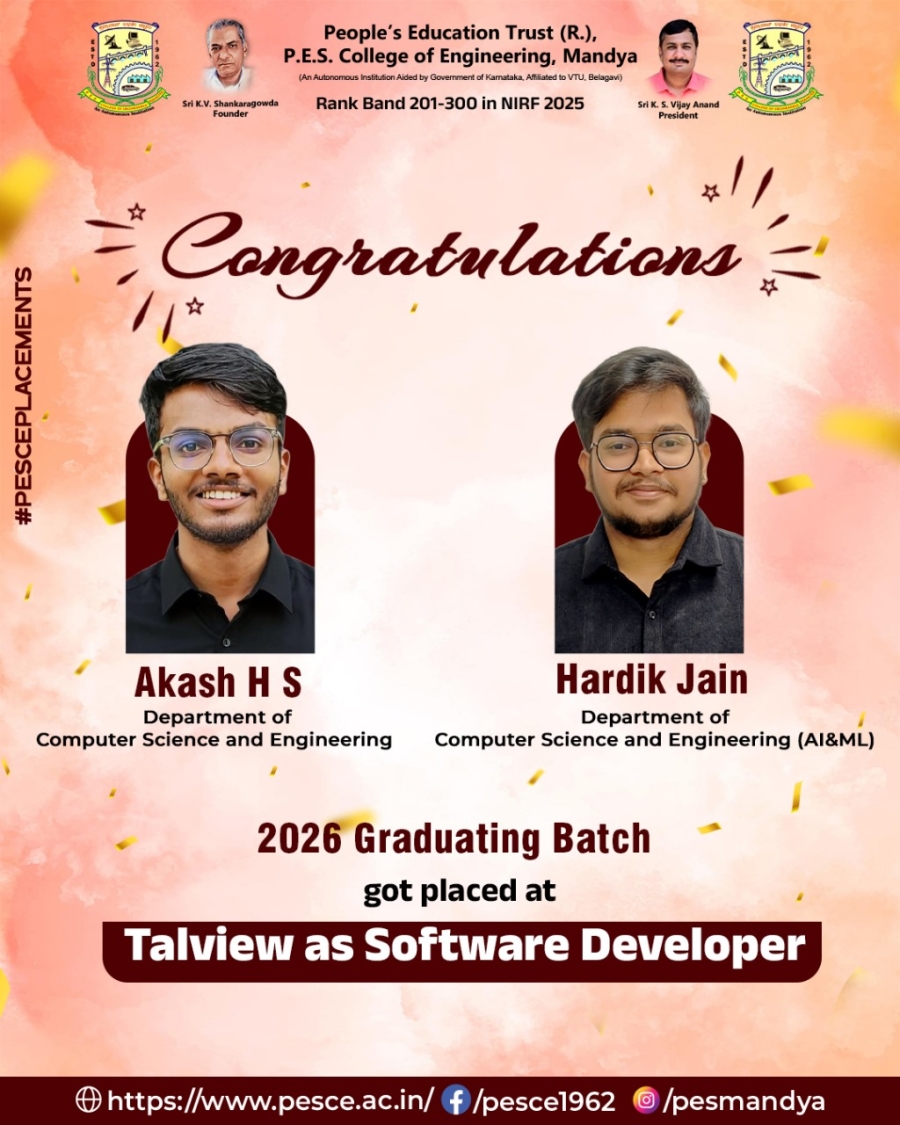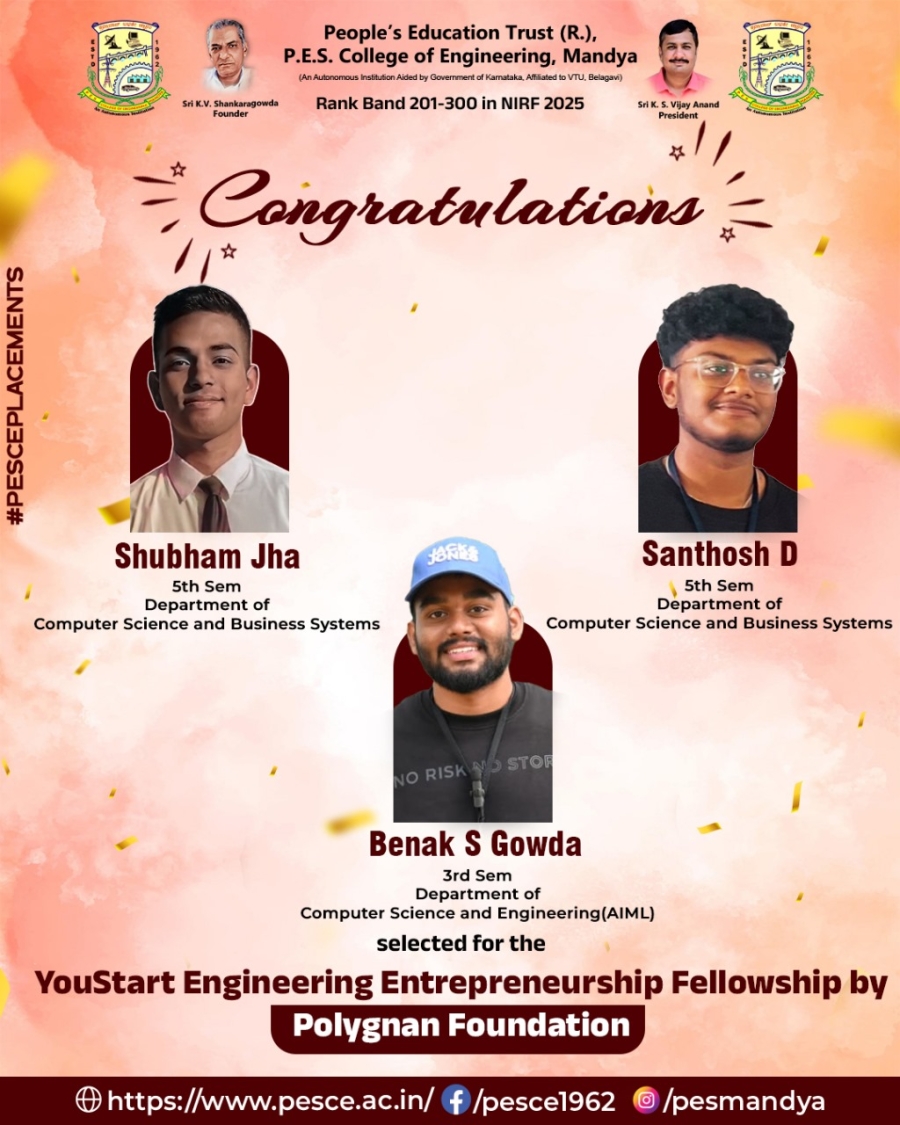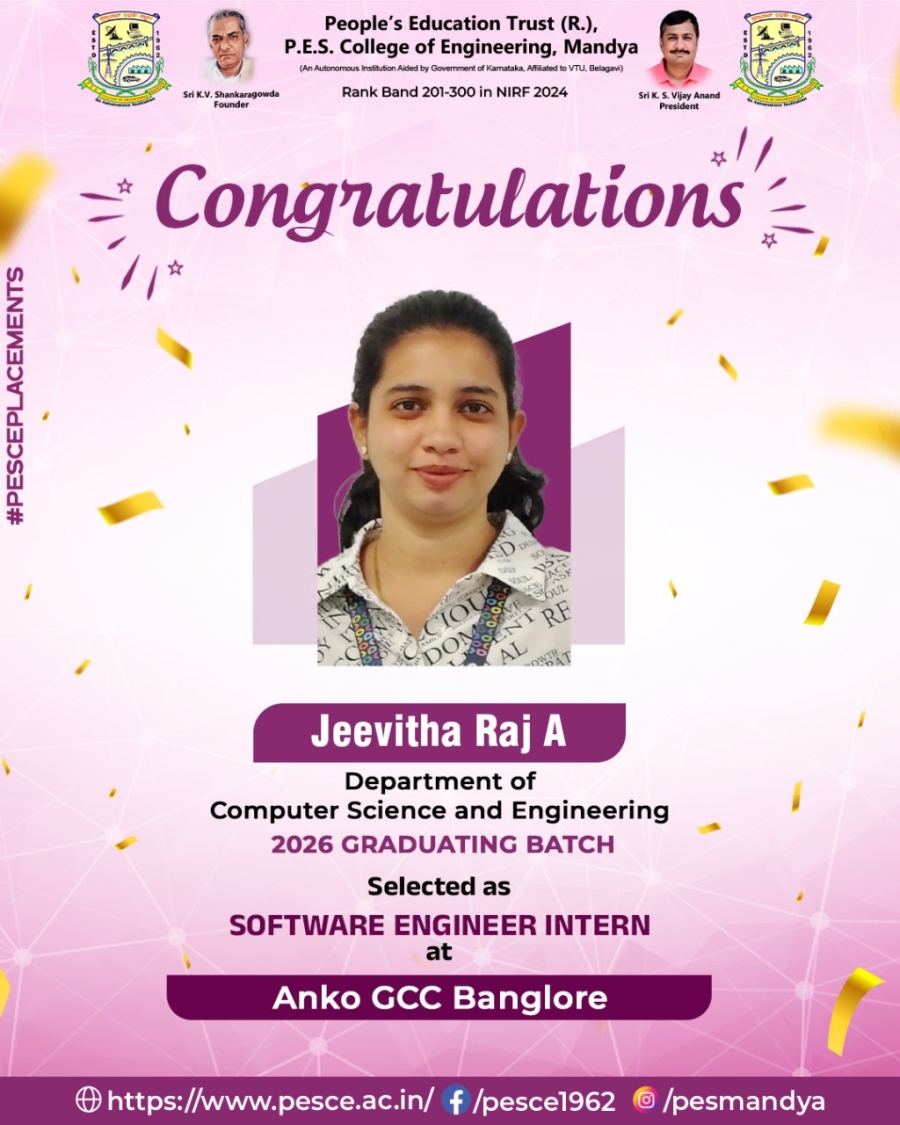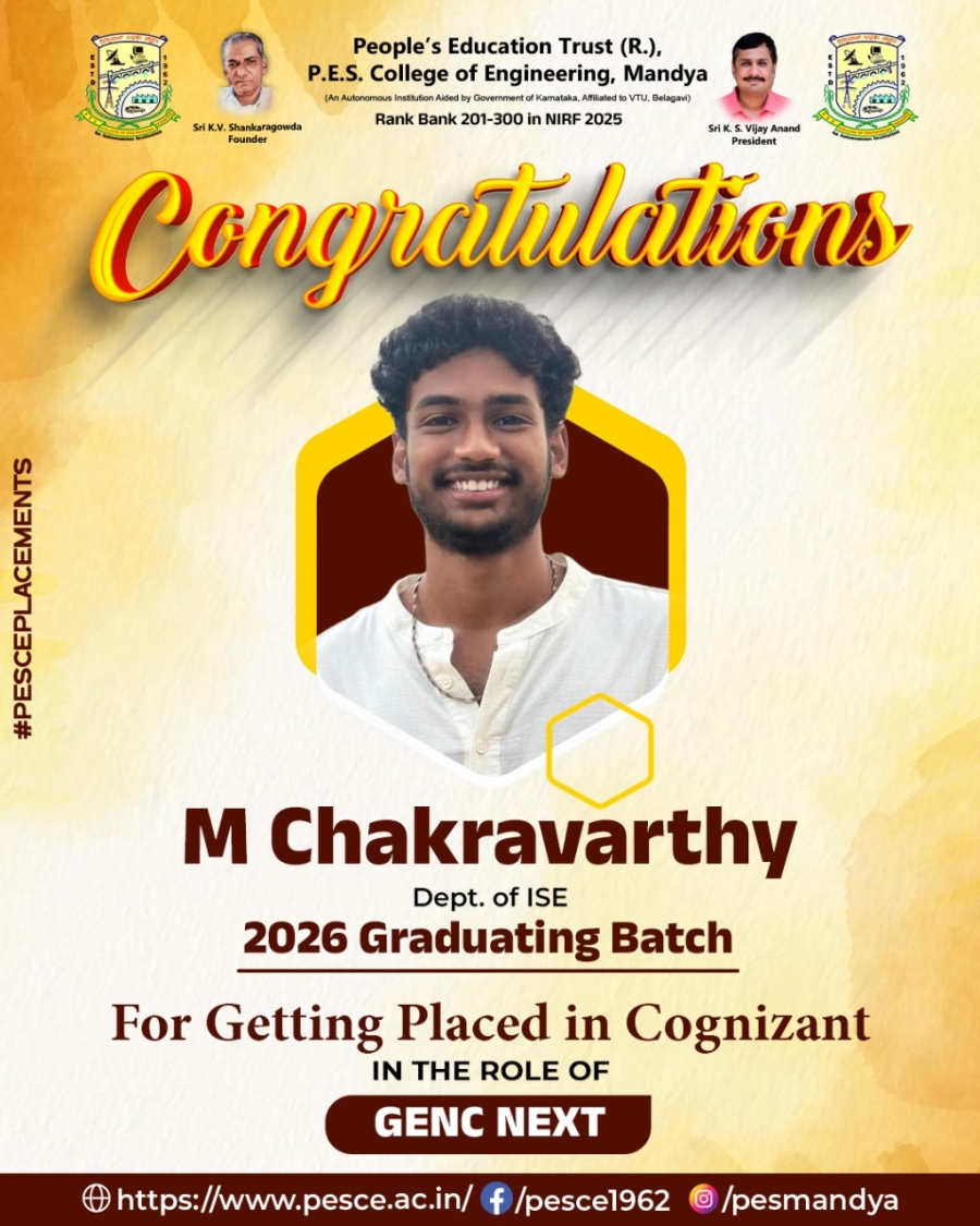 "I am very fortunate to write my experience in PESCE,From the starting day to the last day of my college PESCE has made all my days memorable,Right from diversity to academic excellence PESCE has it all,at last my special thanks to the teachers who have always been the support system for all the students,thank you PESCE for making the future bright of all the students who been part of PESCE....!".